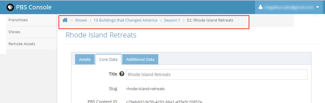 Using the breadcrumbs at the top of each page is the easiest way to not only keep track of where you are in the console, but to return to previous pages without having to back out to the main console home page. The breadcrumbs especially come in handy when creating Collections and adding episodes to your collection since you are operating within the same show.